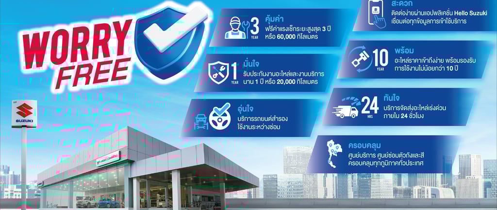– เหนือกว่าความใส่ใจ คือความเข้าใจทุกความต้องการ” “หลักการของ Cause We Care คือ การมุ่งไปข้างหน้าโดยไม่ต้องรอให้ลูกค้าหรือใครมาบอกว่าต้องการอะไร ฉะนั้น ในด้านของการช่วยเหลือสังคม เราก็พร้อมเข้าไปช่วยแบ่งเบาและบรรเทาปัญหาของสังคม ด้วยการปลูกฝังจิตสำนึกที่ดีแก่พนักงานและมีส่วนร่วมในกิจกรรมหรือโครงการต่างๆ ด้วยความมุ่งหวังให้องค์กรและชุมชนสามารถอยู่ร่วมกันได้อย่างยั่งยืน” นายวัลลภ กล่าว อีกทั้ง ลูกค้ารถยนต์ซูซูกิยังมั่นใจได้ว่า เราจะมอบการดูแลและบริการด้วยคุณภาพและมาตรฐานที่ดีแก่ทุกท่าน ภายใต้แคมเปญ “SUZUKI WORRY FREE” ที่เริ่มมีผลบังคับใช้ตั้งแต่วันที่ 1 สิงหาคม 2567 ที่ผ่านมาโดยประกอบไปด้วยรายละเอียดการดูแลรถยนต์ของลูกค้า ทั้ง 7 หัวข้อดังนี้