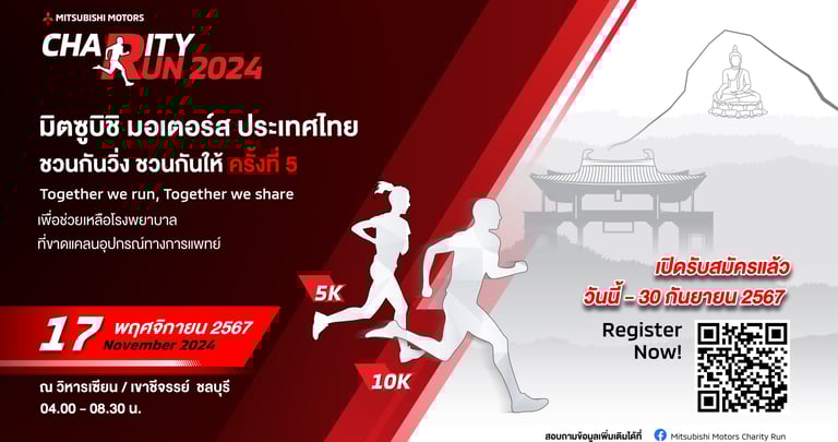 กรุงเทพฯ – 16 สิงหาคม 2567: บริษัท มิตซูบิชิ มอเตอร์ส (ประเทศไทย) จำกัด และ มูลนิธิ มิตซูบิชิ มอเตอร์ส ประเทศไทย ขอเชิญทุกท่านเข้าร่วมงานวิ่งการกุศล “มิตซูบิชิ มอเตอร์ส ชวนกันวิ่ง ชวนกันให้ ครั้งที่ 5” (Mitsubishi Motors Charity Run 2024 #5'Together We Run, Together We Share') ในวันอาทิตย์ที่ 17 พฤศจิกายน 2567 พร้อมเปิดรับสมัครตั้งแต่วันนี้ – 30 กันยายน 2567