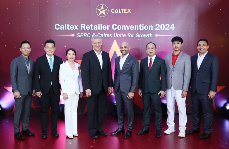 เมื่อเร็ว ๆ นี้ นายโรเบิร์ต โดบริค กรรมการและประธานเจ้าหน้าที่บริหาร (ที่ 4 จากซ้าย) และ นายชาแชงค์ นานาวาติ รองกรรมการผู้จัดการใหญ่ ด้านการพาณิชย์ บริษัท สตาร์ ปิโตรเลียม รีไฟน์นิ่ง จำกัด (มหาชน) (ที่ 4 จากขวา) จัดงาน “Caltex Retailer Convention 2024” เพื่อขอบคุณผู้ประกอบการสถานีบริการน้ำมันคาลเท็กซ์ทั่วประเทศ ที่ให้ความเชื่อมั่นในศักยภาพของคาลเท็กซ์ พร้อมเผยทิศทางการดำเนินงานของบริษัทฯ ประกาศแผนธุรกิจการลงทุนและเติบโตในไทย เดินหน้าพัฒนาประสิทธิภาพผลิตภัณฑ์และบริการอย่างไม่หยุดยั้ง อีกทั้งยังคงมุ่งมั่นขยายเครือข่ายสถานีบริการน้ำมันคาลเท็กซ์ ตลอดจนเพิ่มทางเลือกร้านค้าและบริการให้กับผู้ใช้รถ เพื่อเสริมความแข็งแกร่งให้กับธุรกิจ และสร้างการเติบโตไปพร้อมกับพันธมิตรตามเป้าหมายที่วางไว้ ณ โรงแรมเซ็นทารา แกรนด์ แอท เซ็นทรัลเวิลด์
