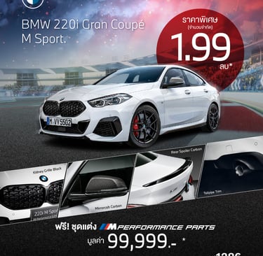 บีเอ็มดับเบิลยู 220i Gran Coupe M Sport เป็นยนตรกรรมสปอร์ตคอมแพ็กต์สำหรับคนรุ่นใหม่ ตัวถังขนาดกะทัดรัด คล่องตัว ผสานเส้นสายและรายละเอียดต่างๆ ที่สะท้อนความเป็น ยนตรกรรม บีเอ็มดับเบิลยู ไว้อย่างครบถ้วน โดยครั้งนี้เพิ่มความสปอร์ตดุดันเหนือระดับ ด้วยการติดตั้งชุดแต่ง M Performance ของแท้ อาทิ กระจังหน้าสีดำ สเกิร์ตข้าง ครอบกระจกข้างคาร์บอนไฟเบอร์ สปอยเลอร์ฝากระโปรงท้ายคาร์บอนไฟเบอร์ และปลายท่อไอเสียแบบสปอร์ต มูลค่ารวมเกือบ 100,000 บาท รวมถึงข้อเสนอพิเศษอื่นๆ อาทิ