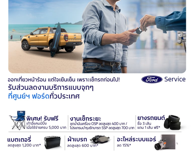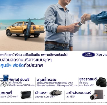 ฟอร์ดได้คัดสรรข้อเสนอพิเศษด้านบริการให้เหมาะกับหน้าร้อนซึ่งเต็มไปด้วยเทศกาลสำคัญ มอบความอุ่นใจให้กับลูกค้ารถยนต์ฟอร์ดทุกรุ่น ไม่จำกัดระยะทาง เพื่อเตรียมความพร้อมก่อนออกเดินทางไปใช้เวลาที่มีค่ากับครอบครัวและคนที่รัก ได้แก่