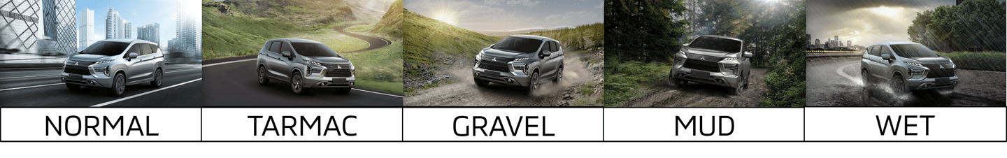 โหมดการขับขี่อีก 5 รูปแบบ ได้รับการสร้างสรรค์ขึ้นเพื่อมอบสมรรถนะสูงสุดในการขับขี่และการควบคุมตัวรถที่ตอบสนองได้อย่างแม่นยำบนพื้นผิวถนนที่มีสภาวะแตกต่างหลากหลายตามภูมิประเทศและภูมิอากาศ โดยพัฒนาระบบขับเคลื่อน 2 ล้อหน้าให้ดียิ่งกว่ารุ่นเดิม ผสานกับระบบควบคุมการขับขี่ต่างๆ ทั้งระบบควบคุมการขับเคลื่อนและสมดุลขณะเข้าโค้ง (Active Yaw Control: AYC) เทคโนโลยีที่เป็นเอกลักษณ์เฉพาะของมิตซูบิชิ ซึ่งเป็นการควบคุมแรงเบรกระหว่างล้อหน้าด้านซ้ายและด้านขวาให้เหมาะสมกับสภาวะการขับขี่ ระบบป้องกันล้อหมุนฟรีและควบคุมการลื่นไถล (Traction Control System: TCL) ที่ช่วยตรวจจับอาการลื่นไถลของล้อหน้าและควบคุมพละกำลังการขับเคลื่อน ระบบควบคุมอัตราเร่ง (Acceleration Control) ที่ช่วยปรับกำลังมอเตอร์ไฟฟ้าและเครื่องยนต์ให้ทำงานสอดประสานอย่างมีประสิทธิภาพเมื่อมีการกดคันเร่ง และระบบควบคุมน้ำหนักพวงมาลัย (Steering Control) ที่ช่วยปรับน้ำหนักของพวงมาลัยให้ตอบสนองได้ดั่งใจตามความเร็วและสภาพพื้นผิวถนน