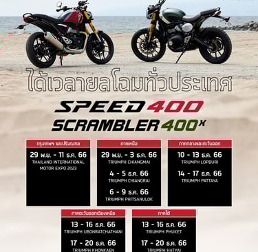 กรุงเทพฯ 12 ธันวาคม 2566 – ไทรอัมพ์ มอเตอร์ไซเคิลส์ เผยความร้อนแรงที่หยุดไม่อยู่ของ “สปีด 400” (Speed 400) และ “สแครมเบลอร์ 400 เอ็กซ์” (Scrambler 400 X) ที่ล่าสุดมียอดจองทะลุไปแล้วกว่า 500 คัน โดยทั้งสองรุ่นนับเป็นรถจักรยานยนต์รุ่นใหม่ล่าสุดของทางค่าย มาพร้อมเครื่องยนต์สูบเดี่ยว TR-Series ขนาด 398 ซีซี ที่พัฒนาขึ้นใหม่ทั้งหมด นำเสนอขีดความสามารถระดับแนวหน้า ทั้งคุณสมบัติที่มีมาตรฐานระดับสูง เทคโนโลยีที่มุ่งเน้นการขับขี่ คุณภาพและรายละเอียดระดับพรีเมียมที่ได้รับการออกแบบและพัฒนาตามแบบฉบับของไทรอัมพ์รวม DNA ที่เป็นเอกลักษณ์ไว้อย่างครบถ้วน โดยทีมงานไทรอัมพ์ในประเทศอังกฤษ พร้อมมีฐานการผลิตในประเทศไทย ทั้งหมดนี้เพื่อมอบการขับขี่ที่สนุกสนาน คล่องตัว และสร้างแรงบันดาลใจสำหรับผู้ขับขี่ทุกวัย และทุกระดับประสบการณ์ ตลอดจนมอบความคุ้มค่าในด้านระยะเวลาของการเข้ารับการบำรุงรักษาที่ 16,000 กิโลเมตร หรือ 12 เดือน ซึ่งดีที่สุดในกลุ่มรถจักรยานยนต์ระดับเดียวกัน พร้อมเพิ่มความมั่นใจด้วยการรับประกันคุณภาพ 2 ปีไม่จำกัดระยะทาง และบริการช่วยเหลือฉุกเฉินบนท้องถนนตลอด 24 ชั่วโมง (Roadside Assistance) เป็นระยะเวลา 2 ปีไม่จำกัดระยะทางเช่นกัน