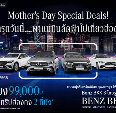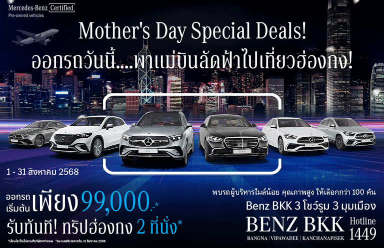 พิเศษ! จองรถ Mercedes-Benz Certified รุ่นใดก็ได้ ระหว่างวันที่ 7–17 ส.ค. 2568 และรับรถภายใน 31 ส.ค. 2568 รับทันที แพ็กเกจทริปพาคุณแม่ไปมู–ช้อปปิ้งที่ฮ่องกง 2 ที่นั่ง มูลค่ากว่า 40,000 บาท*