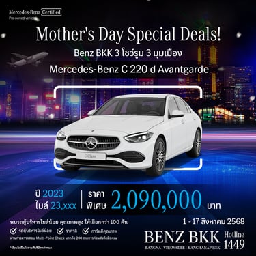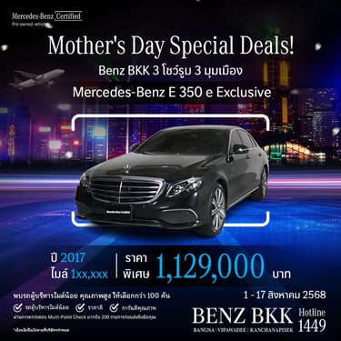 ข้อเสนอสุดพิเศษ ฉลองวันแม่ 7–17 สิงหาคม 2568 ที่โชว์รูม 3 มุมเมือง บางนา – วิภาวดี – กาญจนาภิเษก กรุงเทพฯ – 8 สิงหาคม 2568 – Benz BKK Group ผู้แทนจำหน่ายและศูนย์บริการรถยนต์ Mercedes-Benz อย่างเป็นทางการ จัดแคมเปญ “Mother’s Day Special Deals!” ฉลองเทศกาลวันแม่ มอบข้อเสนอสุดคุ้มให้ลูกค้าที่ต้องการเป็นเจ้าของรถยนต์ Mercedes-Benz Certified รถเบนซ์มือสองคุณภาพมาตรฐานเยอรมัน ระหว่างวันที่ 7–17 สิงหาคม 2568 ครอบคลุมทั้ง 3 สาขา บางนา, วิภาวดี และกาญจนาภิเษกไฮไลต์แคมเปญ Mother’s Day Special Deals!
