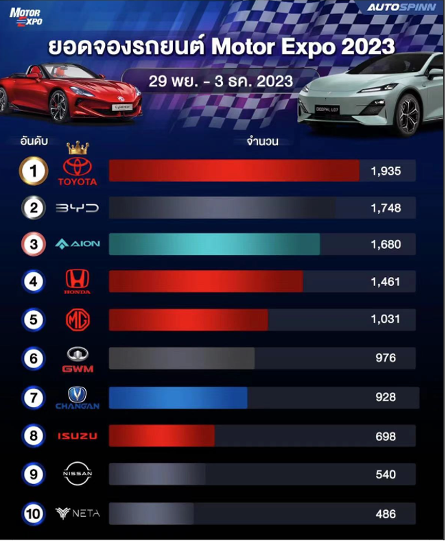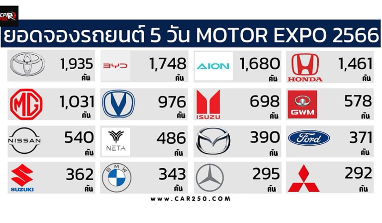 ยอดจองของ AION ภายในงาน Motor Expo 2023 เป็นที่น่าจับตามองเป็นอย่างมาก โดยในเวลาเพียง 5 วัน มียอดการสั่งซื้อสูงถึง 1,680 คัน ตามตัวเลขดังกล่าวเผยให้เห็นว่า AION ได้กลายเป็นแบรนด์รถไฟฟ้ายอดนิยมในประเทศไทย โดยมียอดขายสูงสุด 3 อันดับแรก ซึ่งสาเหตุที่ทำให้ชาวไทยสั่งซื้อรถยนต์ไฟฟ้าของ AION เป็นจำนวนมาก มีที่มาจากความไว้วางใจของผู้บริโภค ทุกๆ คำสั่งซื้อบ่งบอกถึงการยอมรับในคุณภาพและนวัตกรรมของ AION ตั้งแต่รุ่น AION Y Plus 490 Premium ไปจนถึงรุ่น AION ES ทุกรุ่นต่างได้รับความชื่นชอบจากลูกค้า ด้วยสมรรถนะที่เหนือกว่าและการบริการระดับพรีเมียม